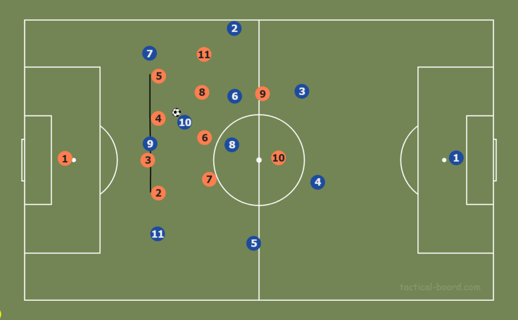Figuur 3. Nummer 4 dekt door op nummer 9. De hoek voor diagonale (steek-)passing achter de laatste linie wordt daardoor veel groter voor de nummer 10 aan de bal. De nummers 8 en 11 zouden daardoor makkelijker bereikt kunnen worden en in scoringspositie gebracht.